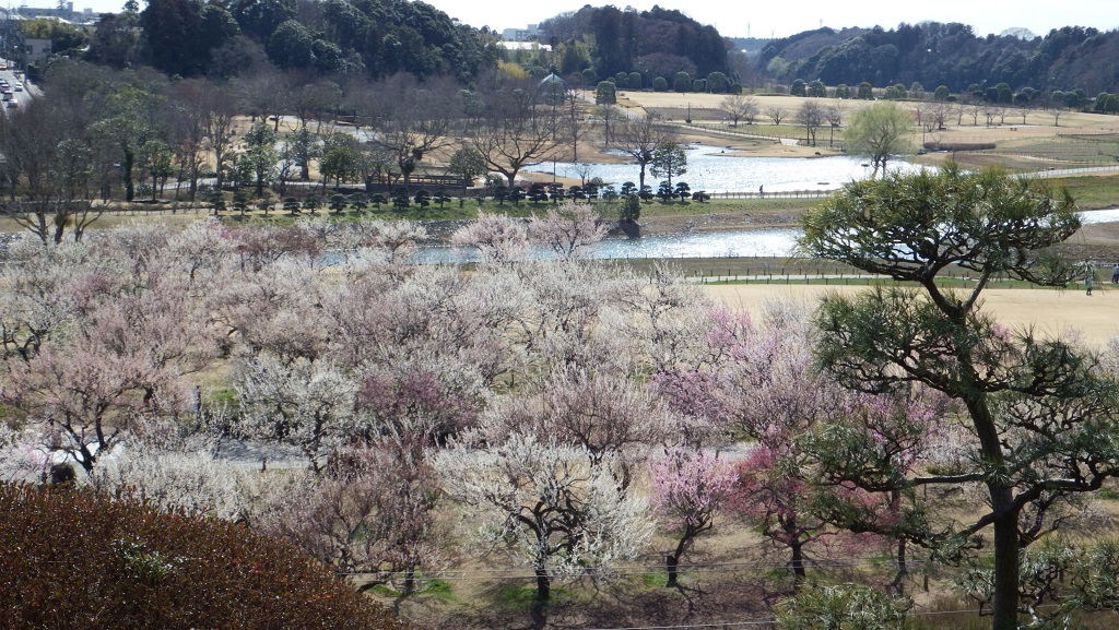 偕楽園の高台から見下ろすと、千波湖や、近くの梅が見えます。