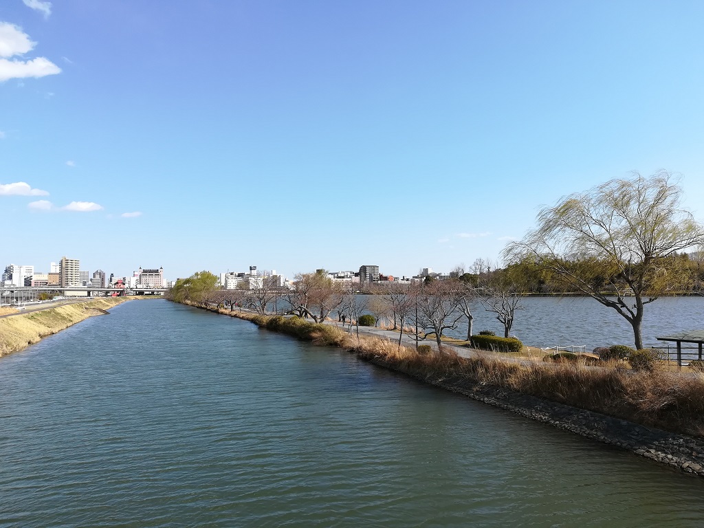 水戸駅の南口から出て川沿いを2.5km歩くと、偕楽園に着きます。