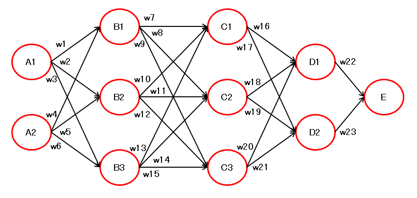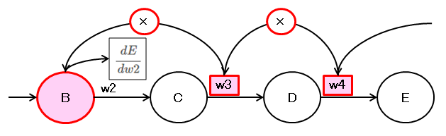 \( \dfrac{dE}{dw2} = \dfrac{dE}{dD} \dfrac{dD}{dC} \dfrac{dC}{dw2} = w4 \cdot w3 \cdot B \)