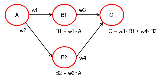 \( \dfrac{dC}{dw1} = w3 \cdot \dfrac{dB1}{dw1} + w4 \cdot \dfrac{dB2}{dw1} \)