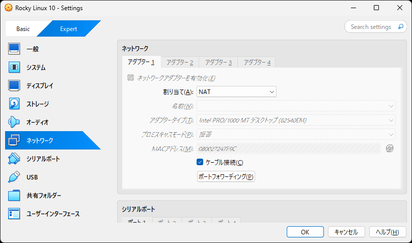 左上の「Expert」をクリックして、ネットワークの「ポートフォワーディング」をクリックします。