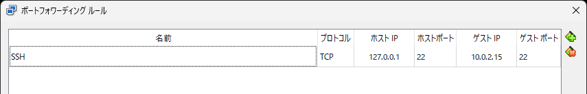 127.0.0.1:22 に送信した内容が 10.0.2.15:22(VM の IP アドレス)に転送されるように入力します。